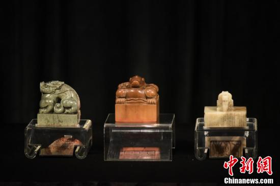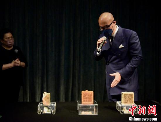 3月25日,香港苏富比中国艺术品部呈献明清御玺三方,包括明洪熙永乐仁孝文皇后青玉龙钮谥宝、清康熙帝御宝檀香木异兽钮“敬天勤民”方玺及清乾隆帝御宝交龙钮白“纪恩堂”玉玺,见证明清两朝更迭。图为展示的中国明清朝御玺三方。