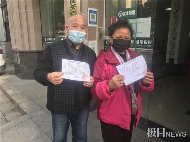 3月28日下午,在湖北省荣军医院,73岁的市民何爹爹和老伴高兴地展示着他们的新冠疫苗注射证明。在国家逐步放开新冠疫苗接种年龄限制后,已有越来越多的老年人主动接受疫苗接种。3月28日当天,有800多名市民在荣军医院接种了新冠疫苗,其中有相当数量是65岁以上的老年人。