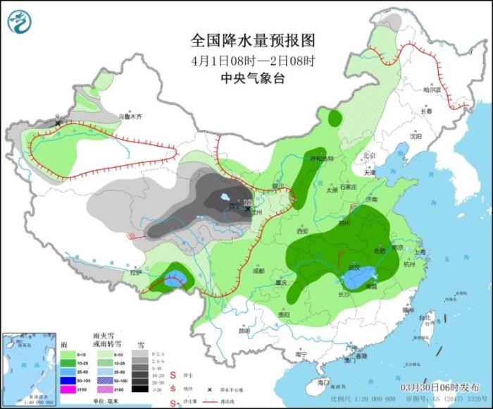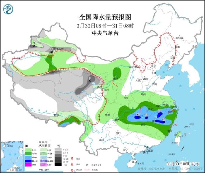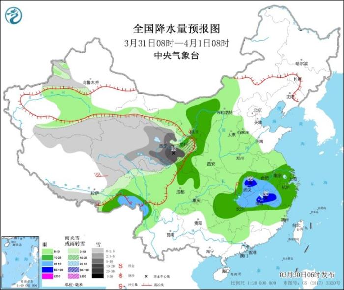 3月30日08时至31日08时,新疆北疆、西北地区中部等地部分地区有小雪或雨夹雪,其中,新疆沿天山地区和伊犁河谷、青海北部和东部、甘肃河西等地部分地区有中到大雪,局地暴雪(10~11毫米)。新疆南疆盆地、西藏东南部、江淮西部、江汉大部、江南大部、重庆东部等地部分地区有中到大雨,其中,安徽南部、湖南北部、江西北部、福建西北部等地部分地区有暴雨(50~65毫米)。宁夏中部、河北北部、湖北北部、浙江北部等地部分地区有4~5级风。