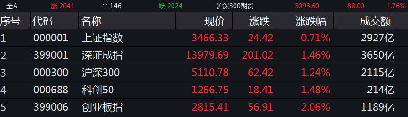 截至收盘,沪指报3466.33点,涨幅0.71%,成交额2926.52亿元;深成指报13979.69点,涨幅1.46%,成交额3650.21亿元;创业板指报2815.41点,涨幅2.06%;上证50指数报3582.65点,涨幅1.22%。