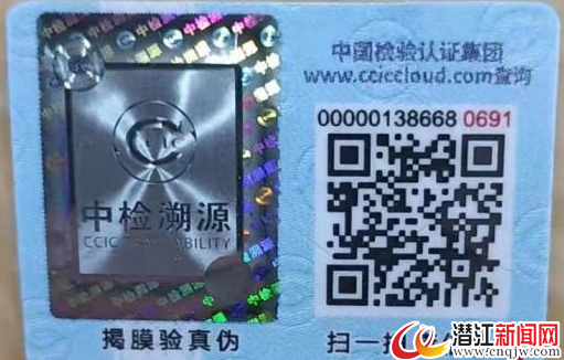追溯标签由“中检溯源”防伪膜和“溯源二维码”两部分组成。消费者可以揭膜验真伪,用手机扫描溯源二维码更方便。