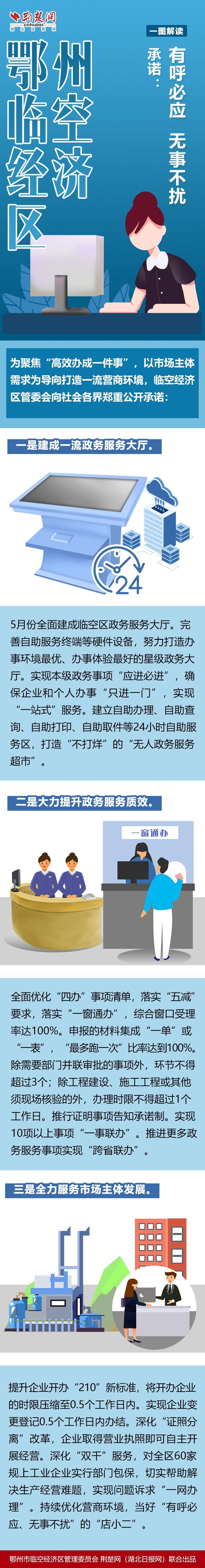 荆楚网(湖北日报网)讯(记者刘璐 通讯员王涛、熊聰)5月10日,鄂州市临空经济区管委会发布营商环境公开承诺书,从“建成一流政务服务大厅”“大力提升政务服务质效”“全力服务市场主体发展”3方面进行公开承诺,全面优化“四办”事项清单,落实“五减”要求,落实“一窗通办”,综合窗口受理率达100%。具体那些承诺?下面小编带您“图”个明白。