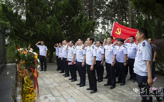 在宛希先、宛希俨革命烈士纪念碑前,黄梅县税务局党委委员、副局长胡勇,县税务局党委委员、副局长贡文彬,仔细整理花篮缎带。全体党员面向纪念碑肃立,向宛希先、宛希俨烈士和已故革命先辈默哀致敬,并在鲜红的党旗下,举起右手,重温入党誓词。