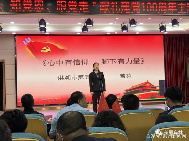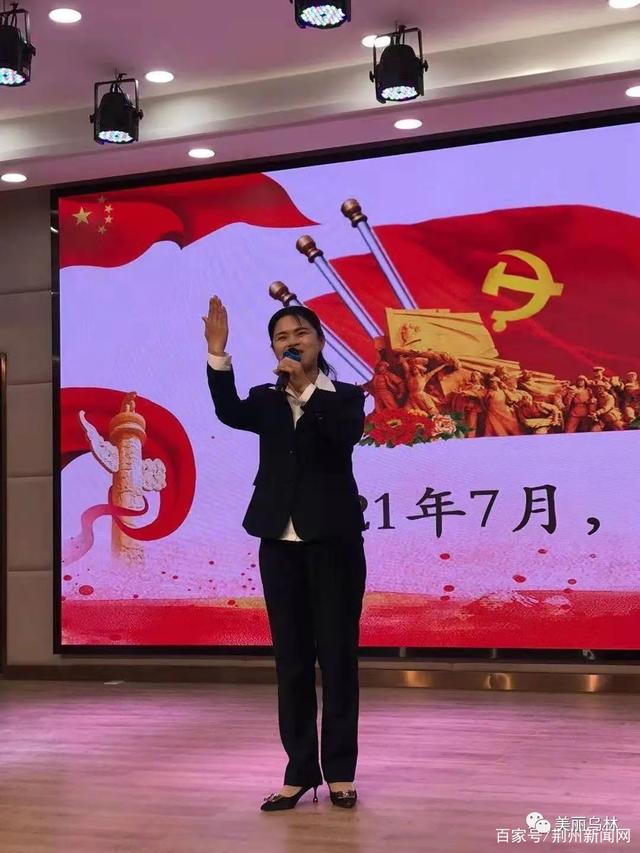 来自洪湖市第五小学的曾芬强调:“心中有信仰,脚下有力量。党员同志们,让我们以时代为己任,时刻牢记入党誓言,在平凡的岗位上实现自己的人生价值!让我们高举红旗,紧跟中国共产党向前!向前!永远向前!”
