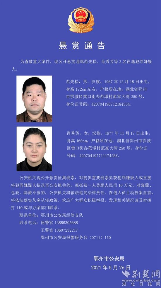 荆楚网(湖北日报网)讯(通讯员 邵峰)5月26日,鄂州市公安局发布悬赏公告,公开悬赏通缉范先松、肖秀芳等2名在逃犯罪嫌疑人,悬赏金额共计20万元。