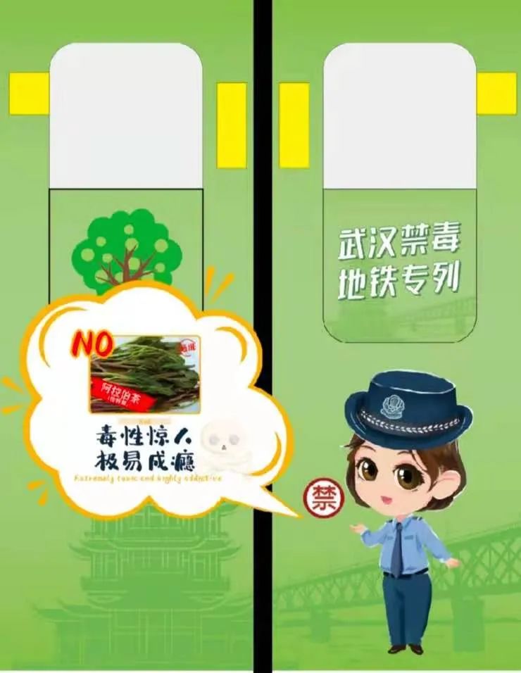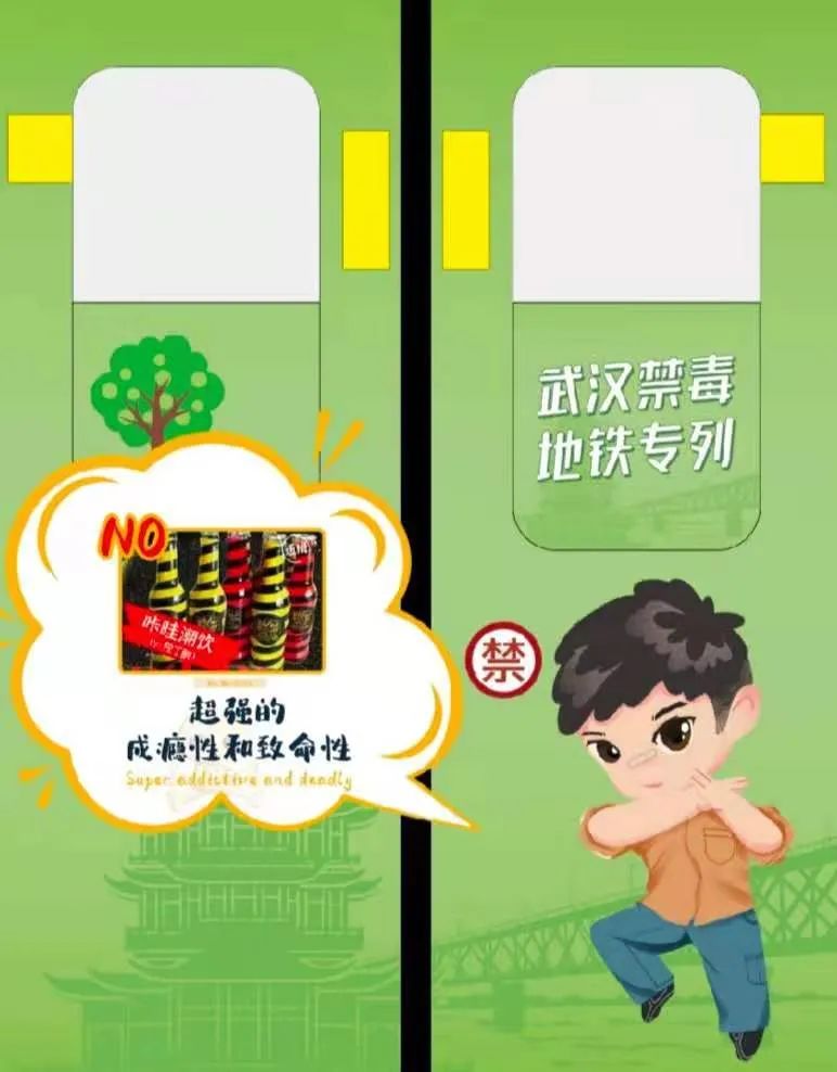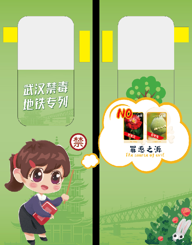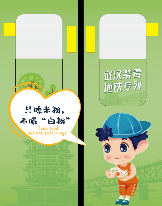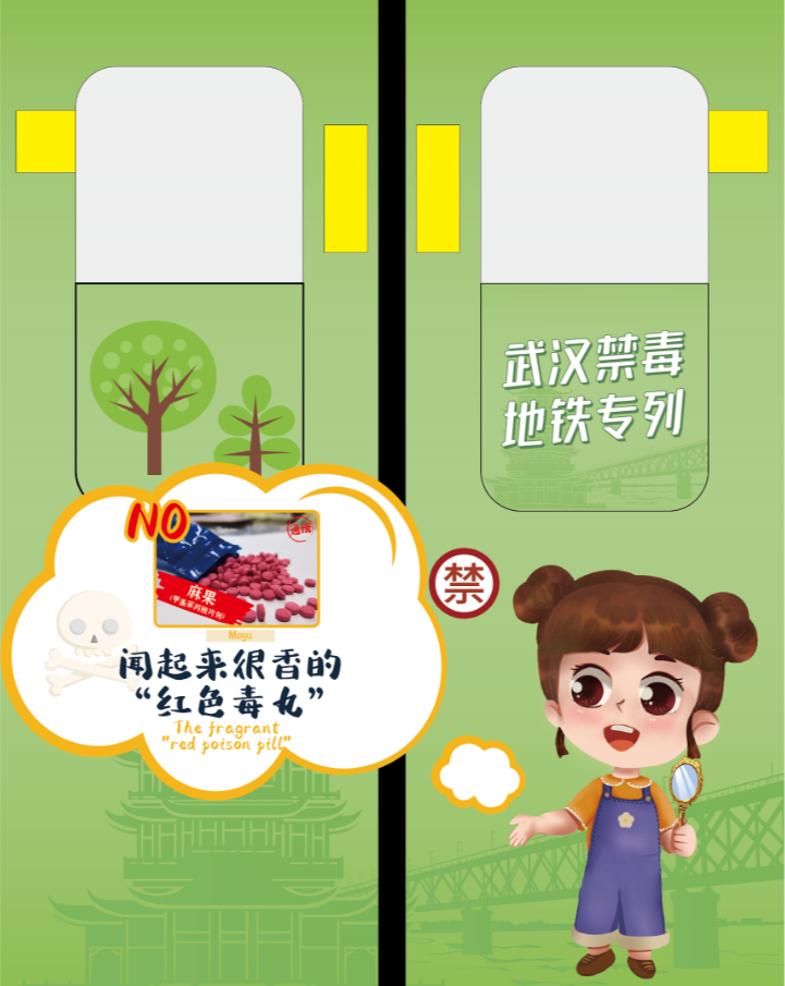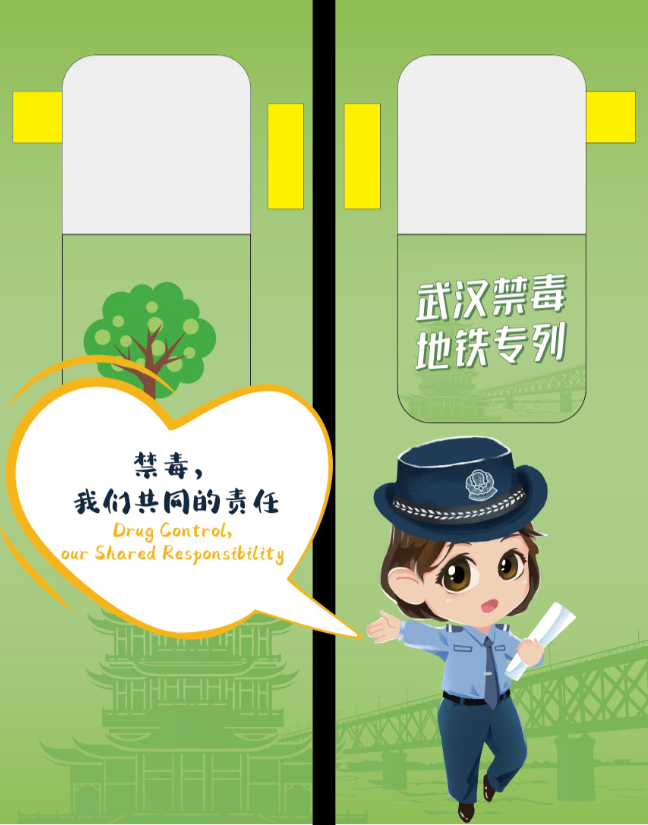 武汉地铁“禁毒主题专列”,全列6节车厢,以“青草绿”为主色调,原创系列生动活泼的卡通人物,采取诙谐有趣、通俗易懂和群众喜闻乐见的方式,向广大市民和旅客朋友,宣传毒品危害,传播“健康无毒,绿色出行”的禁毒理念。呈现出三大亮点: