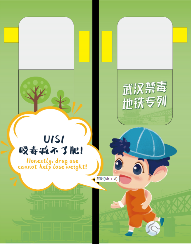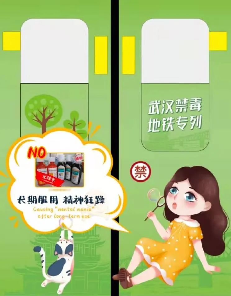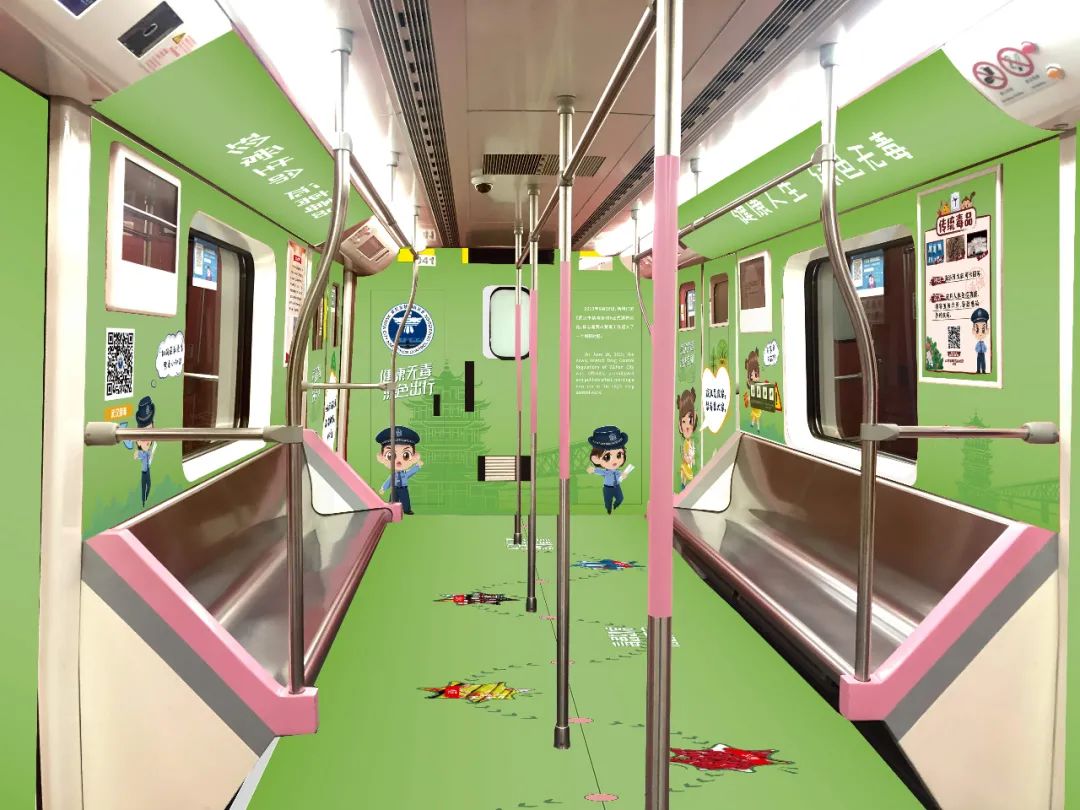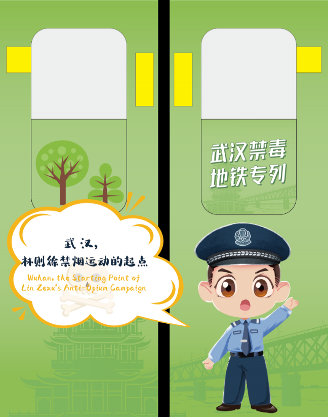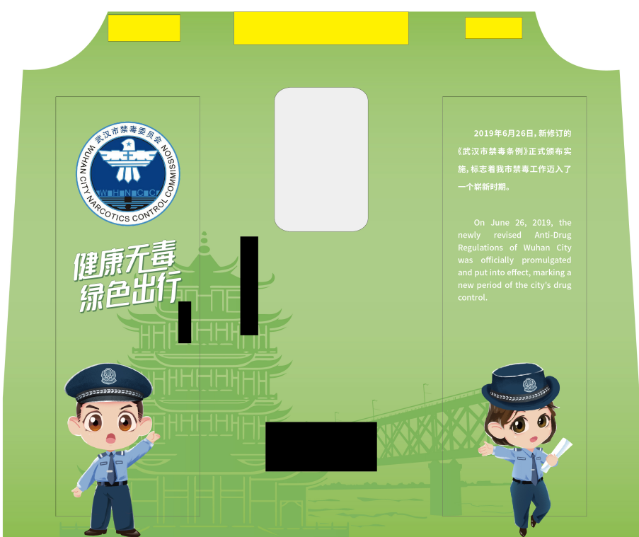 武汉地铁“禁毒主题专列”,全列6节车厢,以“青草绿”为主色调,原创系列生动活泼的卡通人物,采取诙谐有趣、通俗易懂和群众喜闻乐见的方式,向广大市民和旅客朋友,宣传毒品危害,传播“健康无毒,绿色出行”的禁毒理念。呈现出三大亮点: