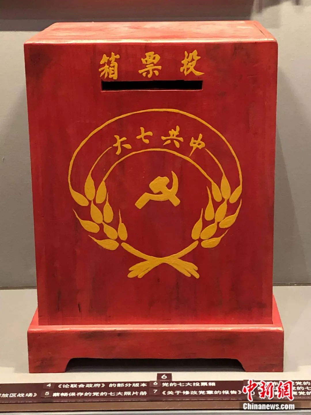 展出的投票箱,整体采用大红底色配以黄色图案,正面以具有陕北地域特色的谷穗为环状底,并饰以党徽、五角星及两面红旗,并用文字注明“七大投票箱”。通过这个投票箱,大会首次以无记名投票方式选举新的中央委员会。