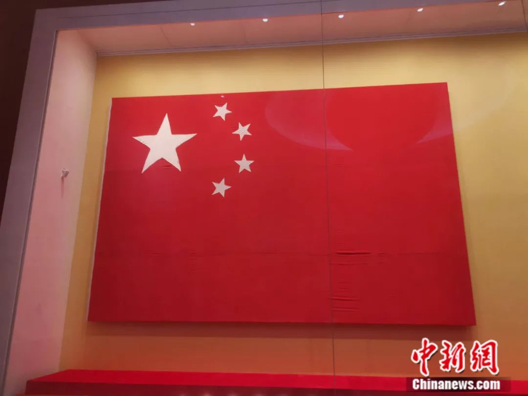 展览馆中,开国大典上升起的第一面五星红旗依然鲜红。时光回到1949年,在物资匮乏的北京,为长约5米宽约3米的国旗找到红色布料和黄绸线并不容易,仔细看还可以发现上面拼补、缝凑的痕迹。
