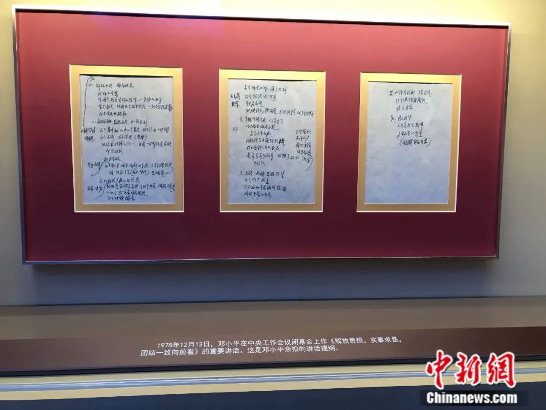 展览中,几张看似普通的白纸上记录了邓小平拟写的讲话提纲,上面第一句话便是解放思想。1978年12月,邓小平在中央工作会议闭幕会上作了《解放思想,实事求是,团结一致向前看》的总结讲话,开启了思想解放运动的序幕。