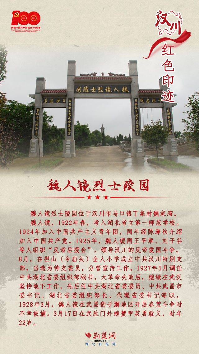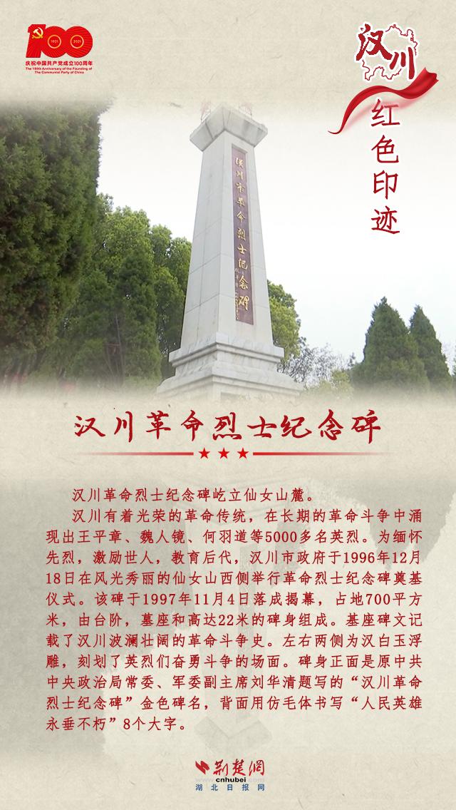 汉川市境内水秀土沃,人杰地灵,有着光荣的革命传统。汉川革命斗争在湖北革命历史中占有重要的地位,在鄂中率先创建了第一个县级中共党组织,涌现出王平章、魏人镜、何羽道等5000多名英烈。