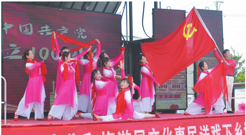6月24日,市文化和旅游局、随州高新区社会事业局、淅河镇人民政府等单位联合组织开展“庆祝中国共产党成立100周年·送红色文艺精品节目下乡”系列演出活动。图为演出活动走进淅河镇先觉庙村,为村民送上了精彩的文艺节目。 (随州日报通讯员王涛摄)