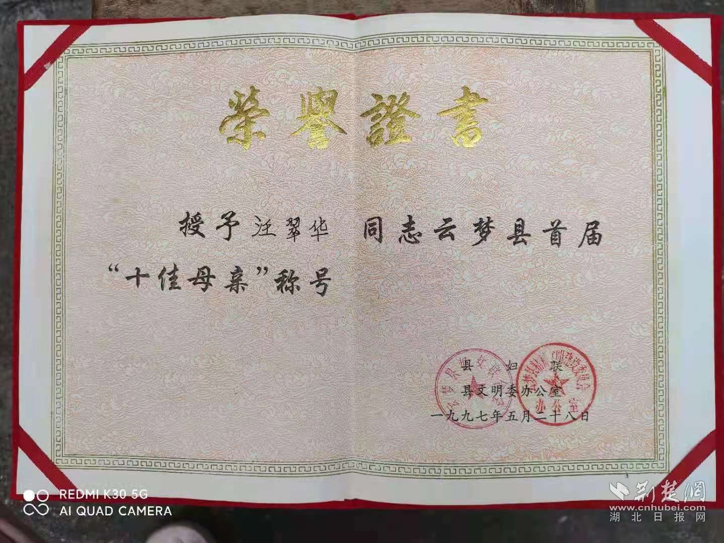 1997年,汪翠华荣获“云梦县首届十佳母亲”称号。通讯员 供图