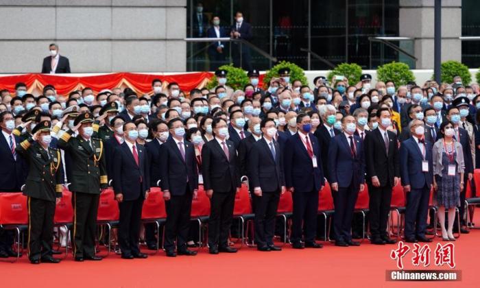 7月1日上午,香港特别行政区政府在金紫荆广场举行升旗仪式,庆祝香港回归祖国及香港特别行政区成立24周年。图为香港特区署理行政长官李家超(前排左六)、香港中联办副主任陈冬(前排左五)等主礼嘉宾出席升旗仪式。 中新社记者 张炜 摄