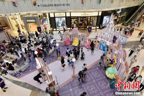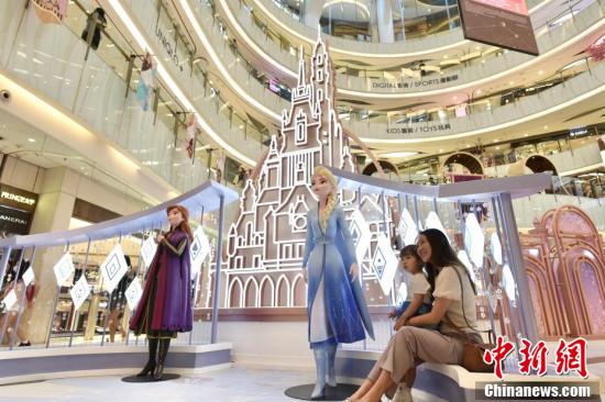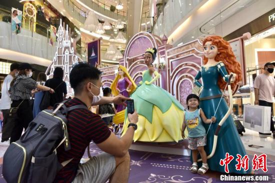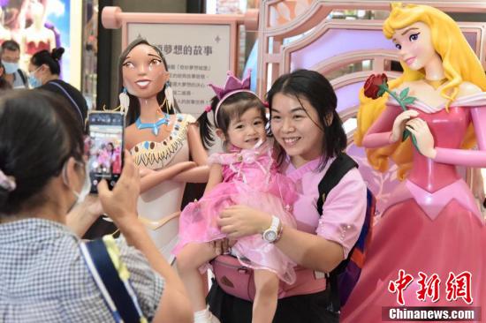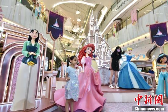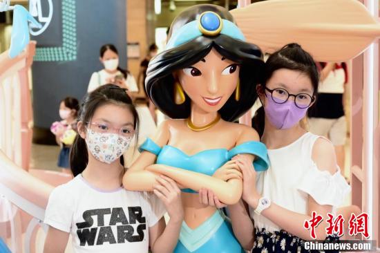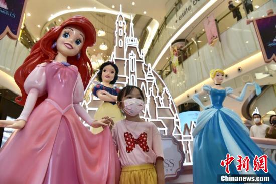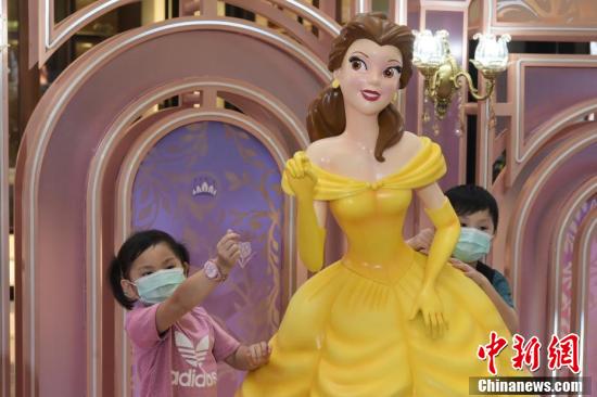香港MOKO旺角新世纪广场7月8日举行迪士尼公主巡礼,齐聚14位迪士尼公主与女王塑像,另设有5米高迪士尼“奇妙梦想城堡”,由此吸引了香港众多家庭到场与塑像合影,享受亲子欢乐时光。图为儿童与迪士尼公主合影。