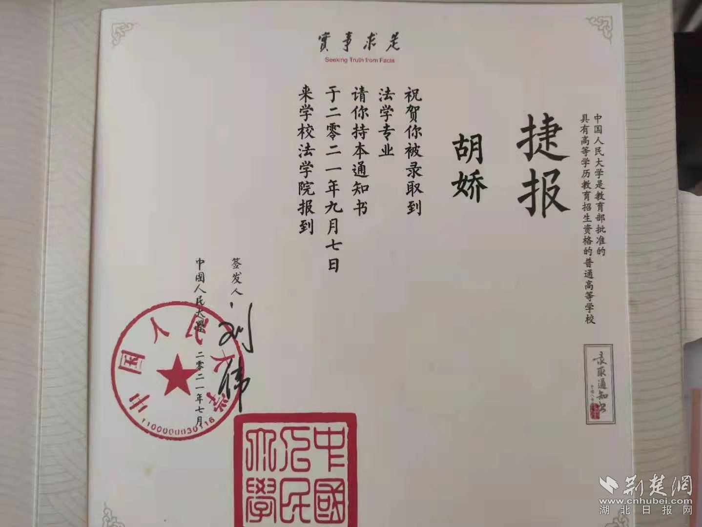 胡娇收到中国人民大学录取通知书。通讯员 供图