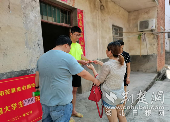 荆楚网(湖北日报网)讯(通讯员 柯文华)7月31日上午,向阳花基金会两位理事长冯南山、程慧来到金盆村高中毕业生陈杰家里,将基金会的赞助资金2000元现金交到陈杰手中,腼腆的陈杰脸上露出了舒心的笑容。