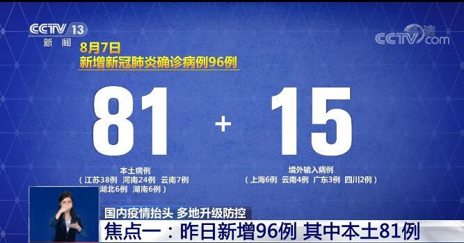 焦点一:先来从数据看变化。国家卫健委今天(8月8日)发布,昨天(7日)各地报告新增新冠肺炎确诊病例96例,其中,本土病例81例,分别为江苏38例,河南24例,云南7例,湖北6例,湖南6例。另外15例为境外输入病例,分别为上海6例,云南4例,广东3例,四川2例。