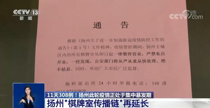 据健康江苏发布消息,8月5日和6日,扬州连续两天单日确诊病例超50例,也就是10天累计确诊病例升至272例;刚才我们也提到了最新的数据是8月7日,扬州新增36例,这样11天新增确诊已经累计308例。据此前流调结果统计,截至8月5日24时的时候,当时扬州已有96例确诊病例曾有过打牌的活动;疫情发展到今天,我们看到此轮由棋牌室引发的传播链仍在延长。