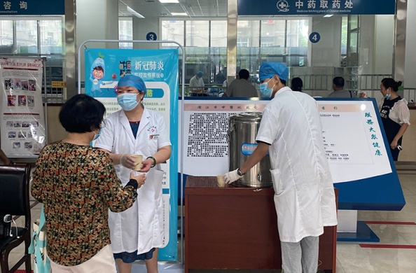 上午9时许,新鲜出炉的汤药被送往住院大厅的免费发放处,大厅渐渐“热闹”起来,医务人员、在院患者、陪护人员、保安保洁,如往常一样有序排队,取药后趁热服下,以预防新冠肺炎,降低感染风险。