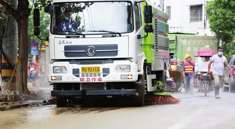 目前,随县柳林镇主街道淤泥、杂物已清理完毕。图为环卫清扫车正在柳林镇交通大道冲洗路面。 (随州日报全媒记者徐斌摄)