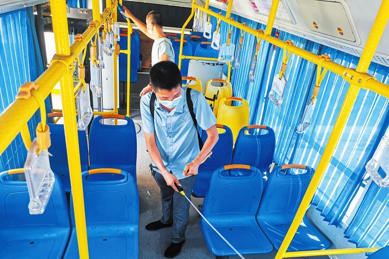 8月19日,市公交公司工作人员,在车辆回场后,对车辆内部座椅、吊环、扶手、空调进出风口等重要位置进行全面消毒作业,确保乘客出行安全。 (随州日报全媒记者李文军摄)