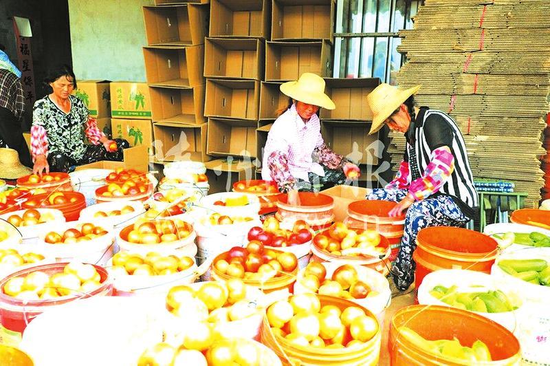 曾都区万店镇深入实施乡村振兴战略,按照“百亩示范、千亩引领、万亩提升”工作思路,大力发展蔬菜产业,带领群众走共同致富之路。图为菜农正在熟练地将刚刚采摘的黄瓜、西红柿等新鲜蔬菜打包装箱,发往全国各地。 (随州日报通讯员杨代飞摄)