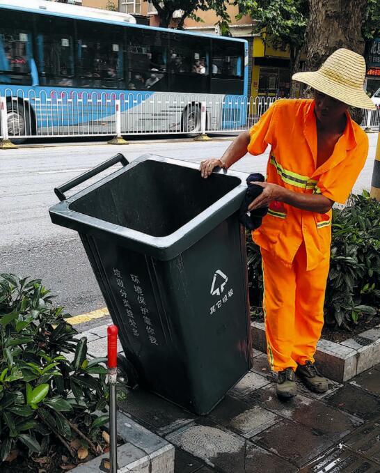 黎兴平在擦拭垃圾桶。全媒体见习记者朱超 摄