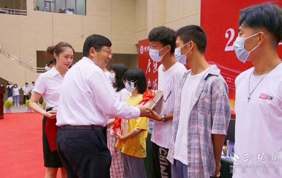 黄冈师范学院党委书记王立兵为新生赠送生日礼物。通讯员 供图