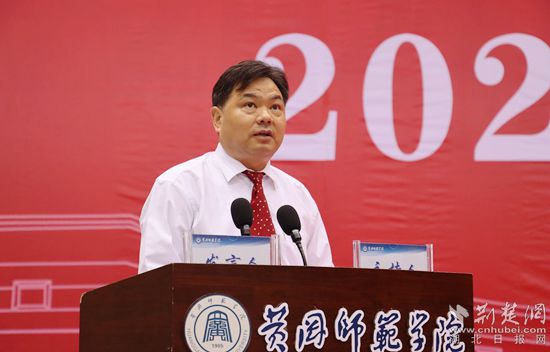 荆楚网(湖北日报网)讯(通讯员 余艳军 刘细松)“谨记黄师校训,厚德、博学、力行、致远。传承黄师精神,尚师表,勇担当,秉诚朴,图自强。尊师爱校,团结友爱,强健体魄,阳光上进。不负时代,不负韶华……”9月6日,黄冈师范学院举行2021级新生开学典礼,全场新生跟读入学誓词。