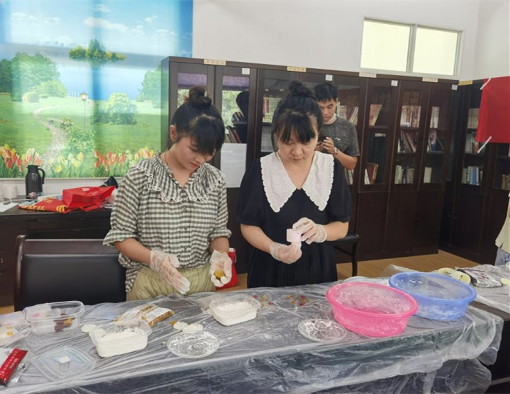 “捏一个小面团,面团中间填上满满的馅,封好口,压花,就成功了!注意,一定要皮薄馅多,吃起来才好吃。”社工耐心讲解,大家热情高涨,跃跃欲试,纷纷参与到制作月饼的过程中。很快,现场呈现出一片繁忙的景象:有的揉搓面团、有的团馅料包月饼、有的压模成型……不一会儿,一个个精美的月饼就做好了。大家看着自己亲手制作的劳动成果,脸上堆满了笑容。
