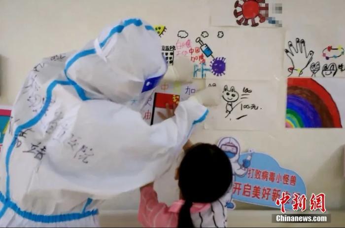 护士孙嘉靖和五岁的小妹妹一起把画贴上墙。福建省立医院护理组供图