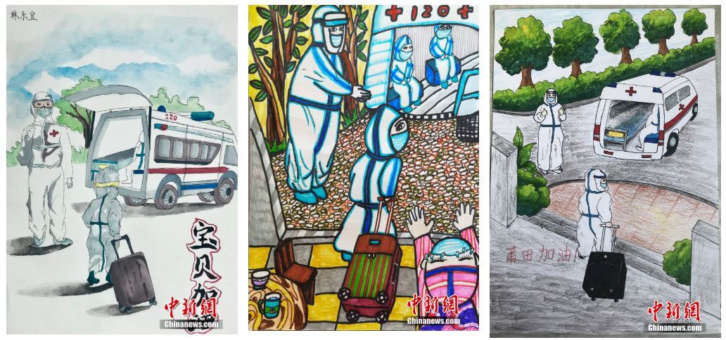仙游当地孩子拿起画笔,表达对同龄人的鼓励和祝福。三幅图为莆田学院附属实验小学的儿童画。