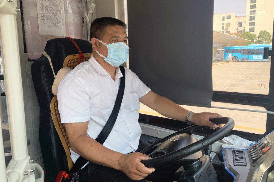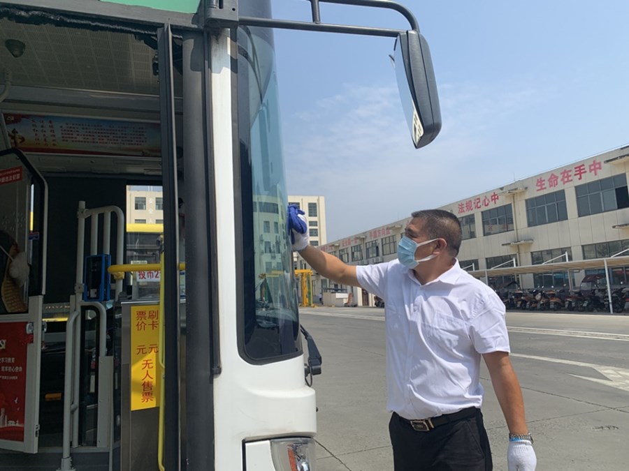 9月17日,在潜江市楚道交投公共交通有限公司,彭保国正在打扫公交车卫生,做发车前的准备工作。