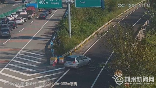 荆州新闻网消息(记者陈明阳)10月4日,沪渝高速公路二广互通附近因车流量大发生交通拥堵,现场多车排队等候,一辆小车驾驶员竟然倒车绕行,这一切被监控拍了下来。