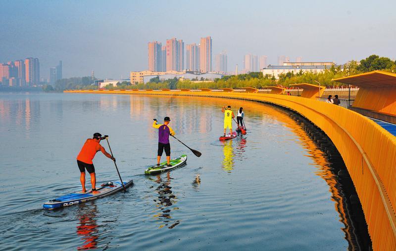 10月7日清晨,随州冬泳协会浆板爱好者正在白云湖上开展浆板训练。近年来,浆板运动以其独特的魅力受到越来越多的人喜爱。 (随州日报全媒记者李文军、通讯员刘耀兰摄)