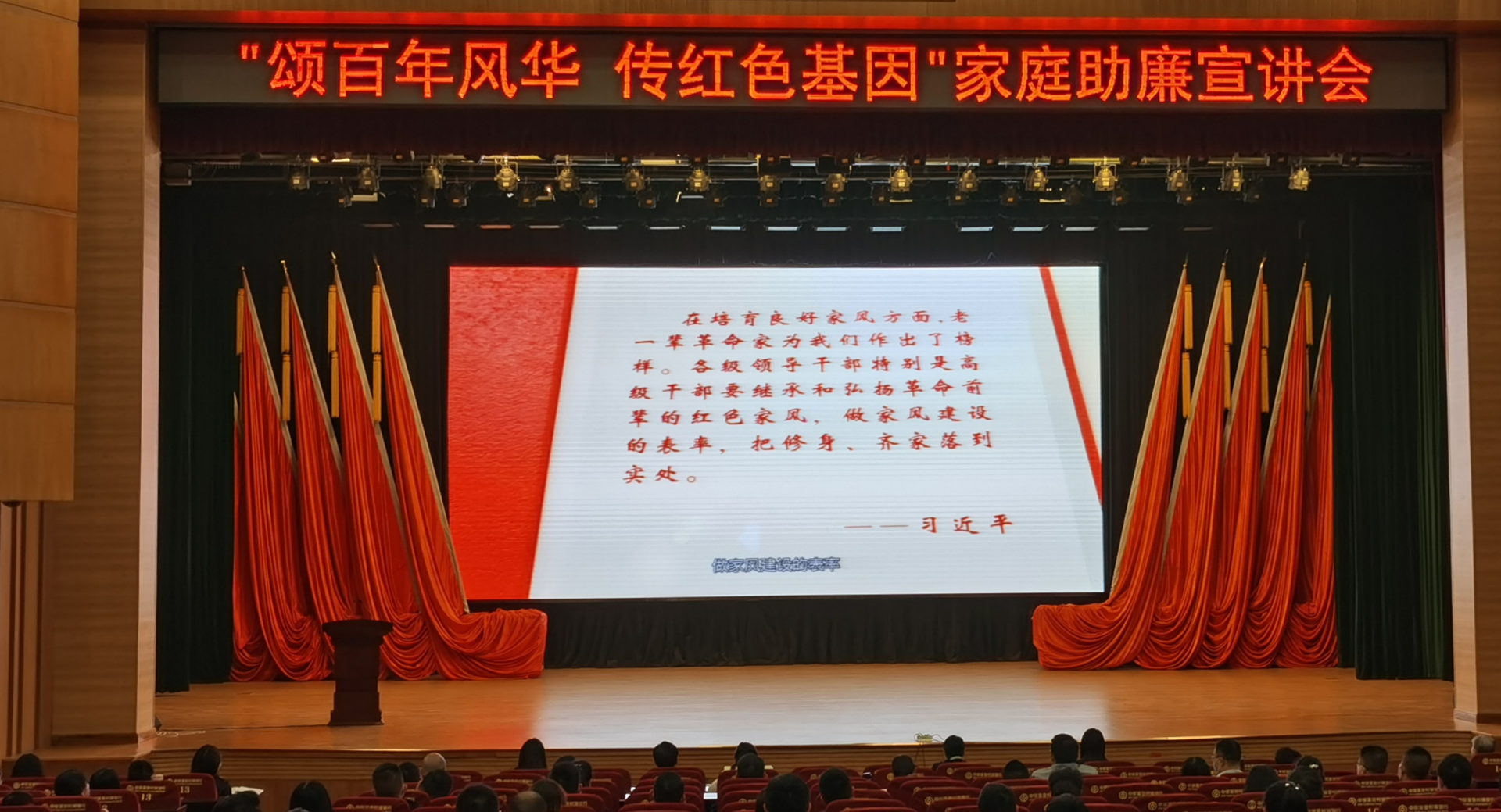潜江新闻网讯(记者 曾俊伟)10月9日上午,以“颂百年风华 传红色基因”为主题的家庭助廉宣讲会在潜江市人民会堂举行。