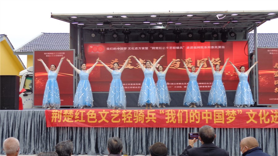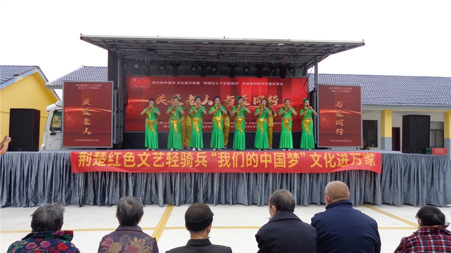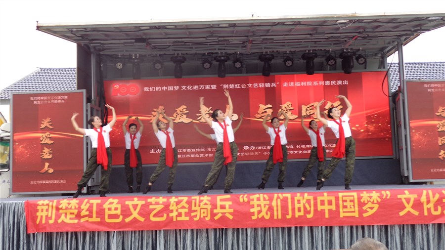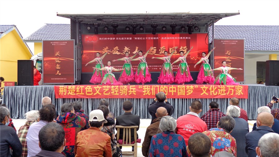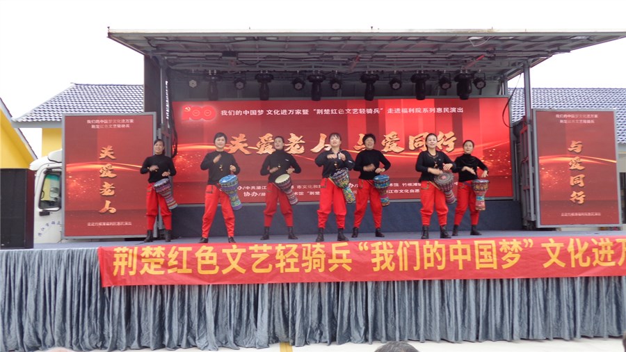 潜江新闻网讯(通讯员 陈训谦 邵乐钧)金秋送爽,丹桂飘香。10月13日,在重阳节来临之际,由潜江市委宣传部、市文化和旅游局主办,市群众艺术馆、竹根滩镇综合文化站承办的“我们的中国梦·文化进万家”荆楚红色文艺轻骑兵“关爱老人 与爱同行”文艺演出走进竹根滩镇福利院。
