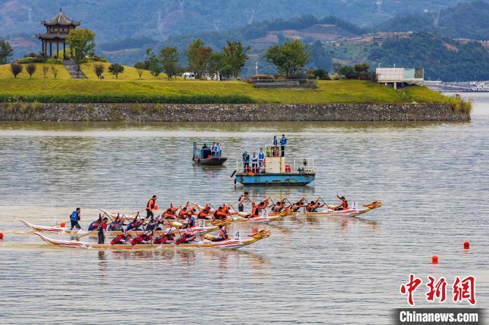 中新网湖北秭归10月16日电 (李彩云 聂爽)2021中国龙舟争霸赛10月15日至16日在湖北秭归县徐家冲港湾国家级龙舟训练基地举行,此次比赛也是符合奥运标准的竞技龙舟亮相东京奥运会后首次参与的正式比赛。来自福建、浙江、湖南及香港等地的12支龙舟队乘风逐浪,击水奋楫。