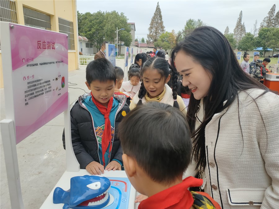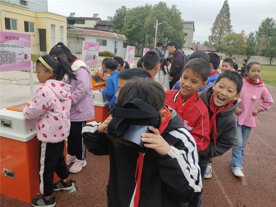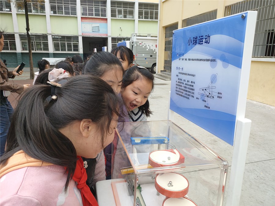 操场上,一个个简单直观可操作的模型,涵盖了光学、电能、磁能、机器能等种类。孩子们在这些科普展品前或驻足观看,或动手操作,有的观察动画的原理,有的测试自己的手眼协调能力,有的摆动小球研究力学原理……孩子们的探讨声、惊叹声此起彼伏,整个校园充满了欢声笑语。