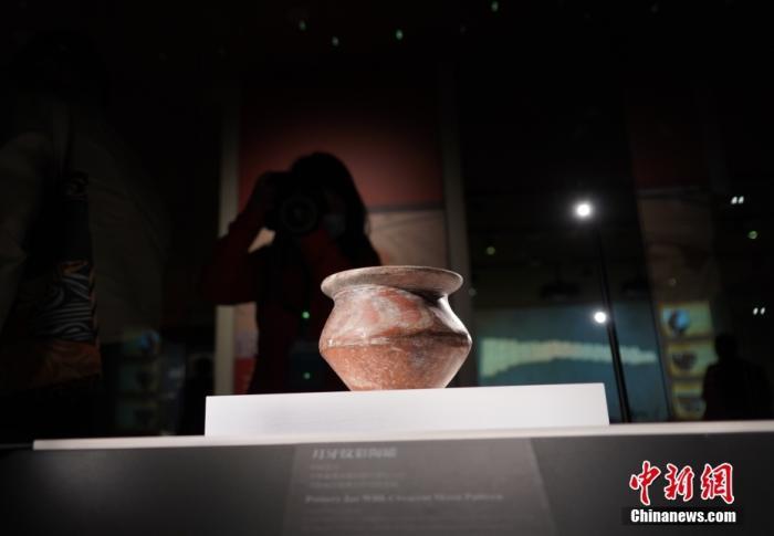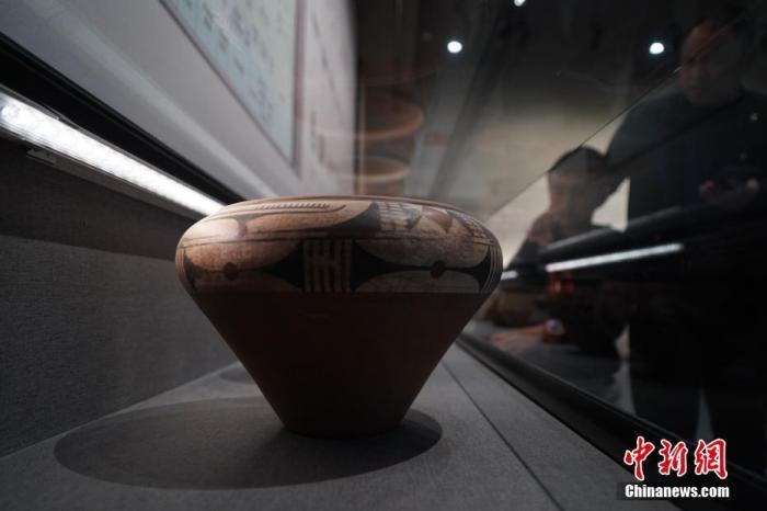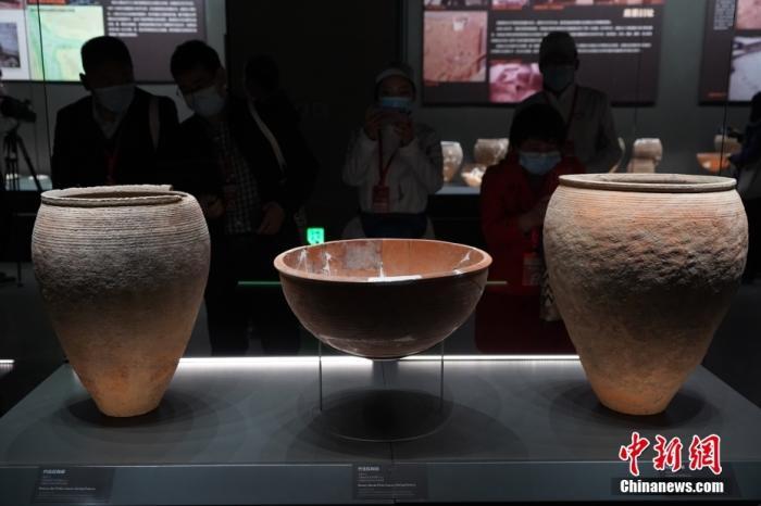 10月17日,记者探访位于三门峡市的庙底沟仰韶文化博物馆。图为展出的陶罐。 中新社记者 阚力 摄