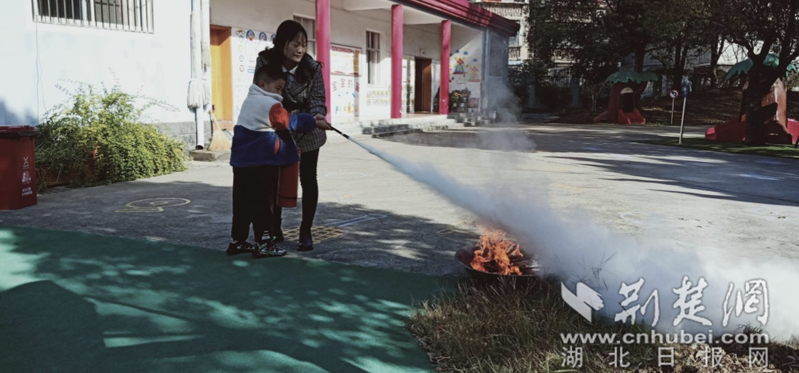 老师指导孩子使用灭火器。通讯员 李蓉 摄
