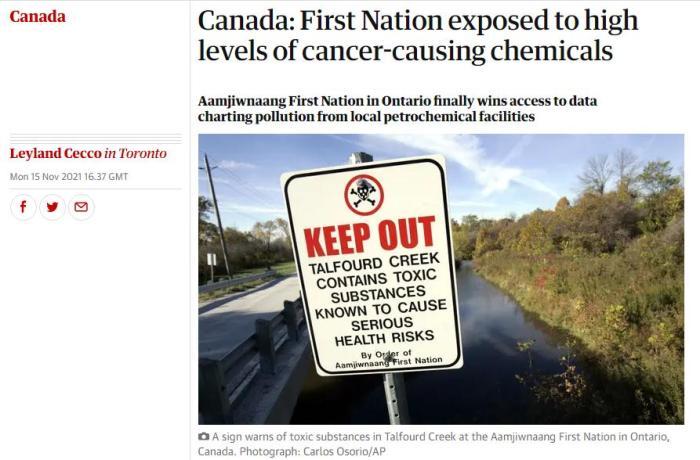 近日,加拿大安大略省的一个原住民社区经过多年努力,终于获得相关数据,证实该社区长年暴露于化学致癌物之中,其含量较安全标准高出44倍。(图片来源:英国《卫报》网站报道截图)