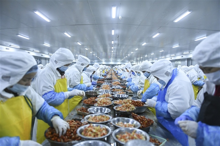 11月12日,位于高场街道的湖北中虾农业科技有限公司车间里,数百名工人正忙着加工调味虾和虾尾。今年前三季度,该企业产值已达3.4亿元。据悉,该企业目前已完成全年技改扩规工作,工人们正铆足干劲加班加点生产,奋力冲刺四季度,确保全年精彩。 记者 杨靖 通讯员 余晓敏 摄