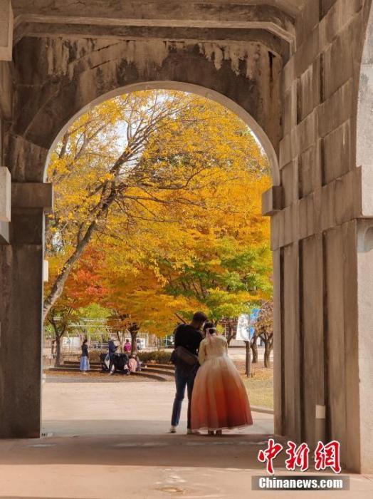 资料图:当地时间10月31日,身着韩服的市民在韩国首都首尔的国立民俗博物馆内欣赏秋景。 中新社记者 刘旭 摄