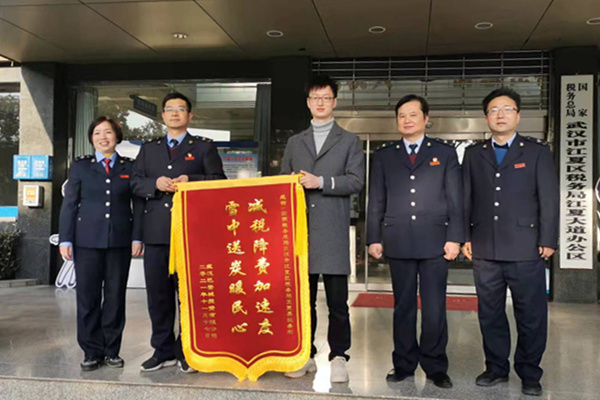 荆楚网(湖北日报网)讯(通讯员严娉、郑金蓉)近日,武汉某投资有限公司财务负责人杨先生专程来到武汉市江夏区税务局,送上了一面写着“减税降费加速度,雪中送炭暖民心”字样的锦旗,感谢税务干部主动作为、加速为其办理退税。