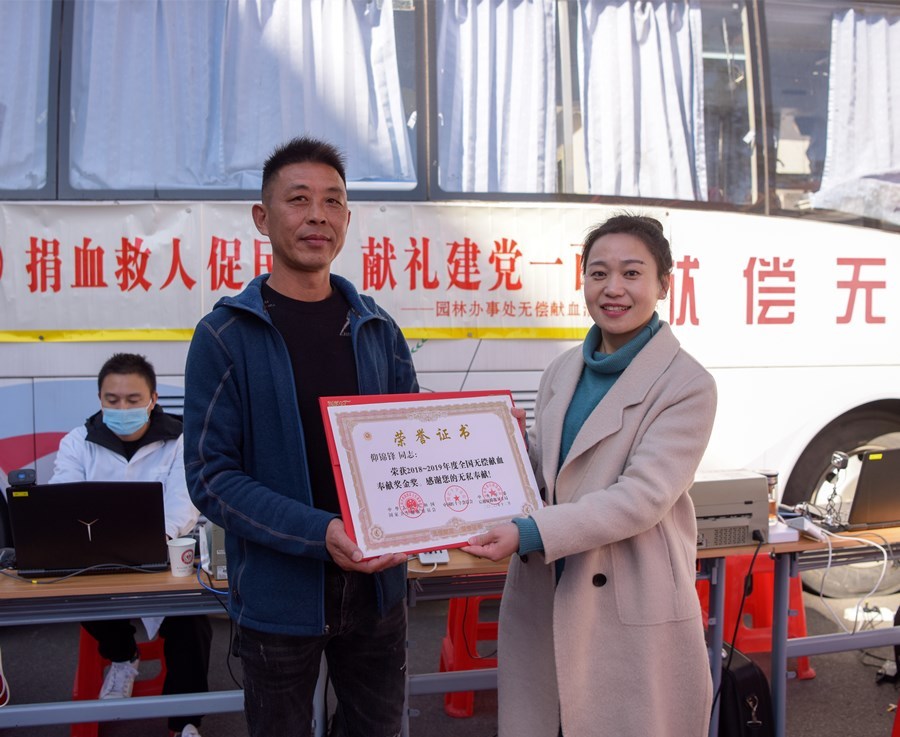 “我坚持义务献血15年了,今年已累计献血9800毫升,还将坚持献下去。”园林街道大桥社区副主任仰景锋说。当天,他与章华社区党委书记、主任郭家兵分别收到了由国家卫健委、中国红十字总会、中央军委后勤保障部卫生局颁发的“2018-2019年度全国无偿献血奉献奖”金奖、银奖证书。