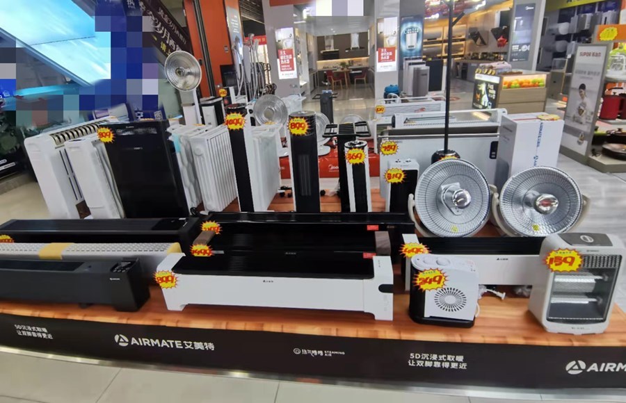 在章华中路的一家大型超市,不同类别的取暖设备被商家摆在显眼的位置,各式各样、应有尽有。