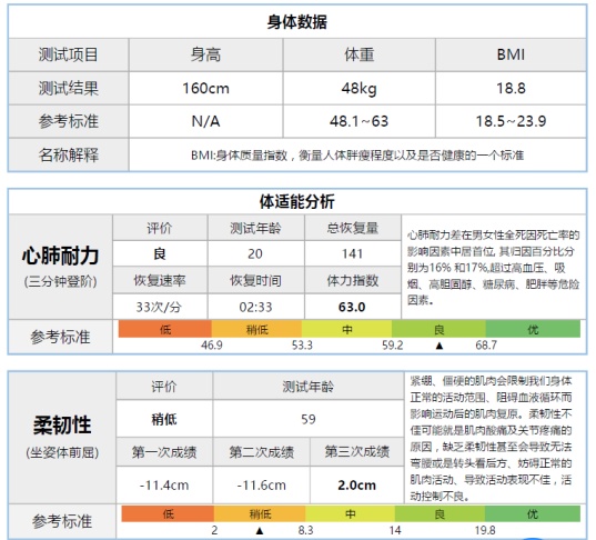通过对您的肌力、柔韧、平衡、反应和心肺功能检测,综合评估您适应环境的运动能力。然后运动管理师根据您的身体情况,给到您适合的运动指导。