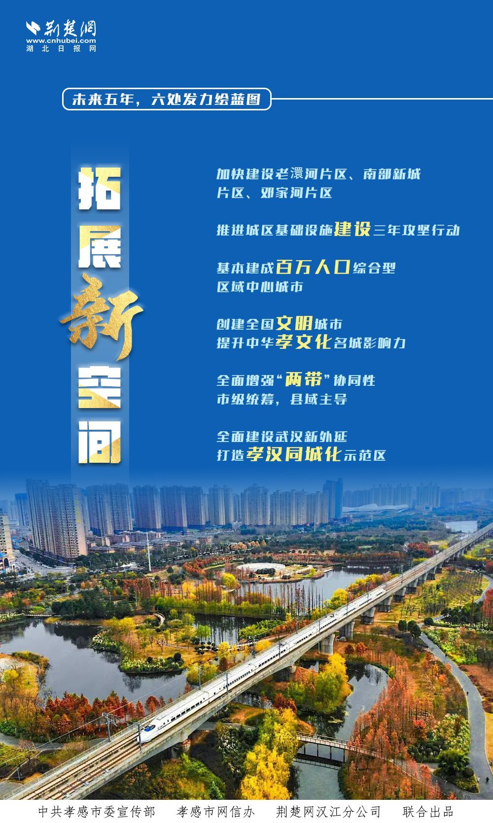 报告指出,今后五年,孝感将全面开启社会主义现代化建设新征程,深入推进“主城崛起、两代协同、孝汉同城、多元支撑”区域发展布局,全力打造武汉城市圈副中心,争当全省高质量发展第二方阵排头兵,为湖北“建成支点、走在前列、谱写新篇”作出孝感新贡献。